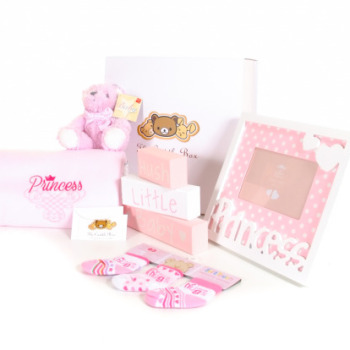 baby Girls gift box H contains a pink princess soft touch blanket, a 4 x 6 inch pink and white photo frame with Princess motif, a small baby teddy in pink, 3 pairs of pink and white baby socks, wooden blocks in pink and white ‘Hush Little Baby’.